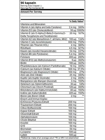 Calciumcitrat, Magnesiumcitrat, Vitamin C (als L‑Ascorbinsäure), Echinacea purpurea‑Extrakt, Traubenkernextrakt, Zinkcitrat, Citrus‑Bioflavonoide, Ingwer‑Extrakt, Olivenblatt‑Extrakt, Alpha‑Liponsäure, Cholinbitartrat, Inositol, Niacin (als Inositol‑Hexanicotinat), Bromelain, Q10, Vitamin E (als Mischung von D‑Alpha, Beta, Gamma, Delta‑Tocopherylen/-trienolen), Pantothensäure (als Calcium‑Pantothenat), Vitamin B6 (als Pyridoxinhydrochlorid), Eisen (als Eisen‑Bisglycinat), Riboflavin, Thiamin (als Thiaminhydrochlorid), Mangan (als Mangan‑Gluconat), Vitamin A (als Alpha+Beta‑Carotin), Kupfer (als Kupfer‑Glycinat), Bor (als Bor‑Citrat), Vitamin D3 (als Cholecalciferol), Lutein, Lycopin, Folsäure, Jod (als Kaliumjodid), Biotin, Chrom (als Chrom‑Picolinat), Vitamin K2 (all‑trans MK‑7), Molybdän (als Natriummolybdat), Selen (als Selenmethionin), Trennmittel (Reiskleieextrakt), Kapselhülle: Hydroxypropylmethylcellulose.