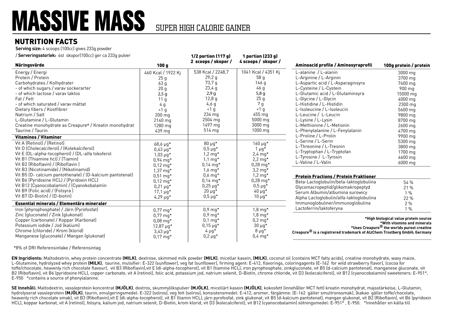 Massive Mass von Swedish Supplements ist ein kalorienreicher Gainer, der hochwertiges Protein und komplexe Kohlenhydrate mit zusätzlichen Leistungsstoffen kombiniert. Er enthält schnelle und langsame Proteinquellen, ergänzt durch Kohlenhydrate, Creatin, Taurin und BCAA – ideal um Muskelaufbau und Regeneration bei hoher Trainingsbelastung zu unterstützen. Pro Portion liefert das Produkt sehr energie‑reiche Kalorien und hilft, katabole Phasen zu überbrücken.