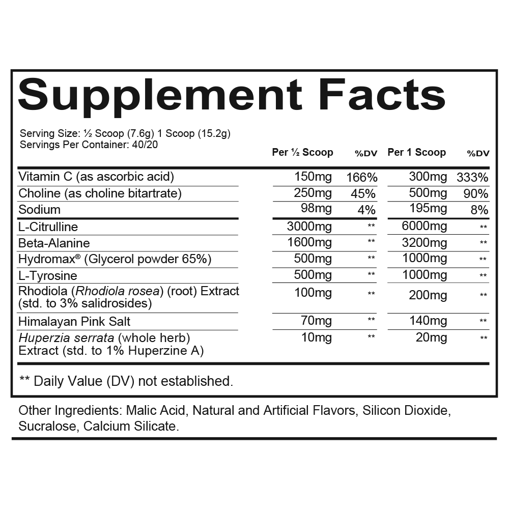 Die genaue Zusammensetzung variiert je nach Geschmack – unter anderem enthalten: L‑Citrullin, Beta‑Alanine, Glycerol‑Pulver (Hydromax®), L‑Tyrosin, Rhodiola rosea Extrakt, Pink Himalayan Sea Salt, Farbstoffe, Aromen, Süßstoffe (z. B. Sucralose), Trennmittel.