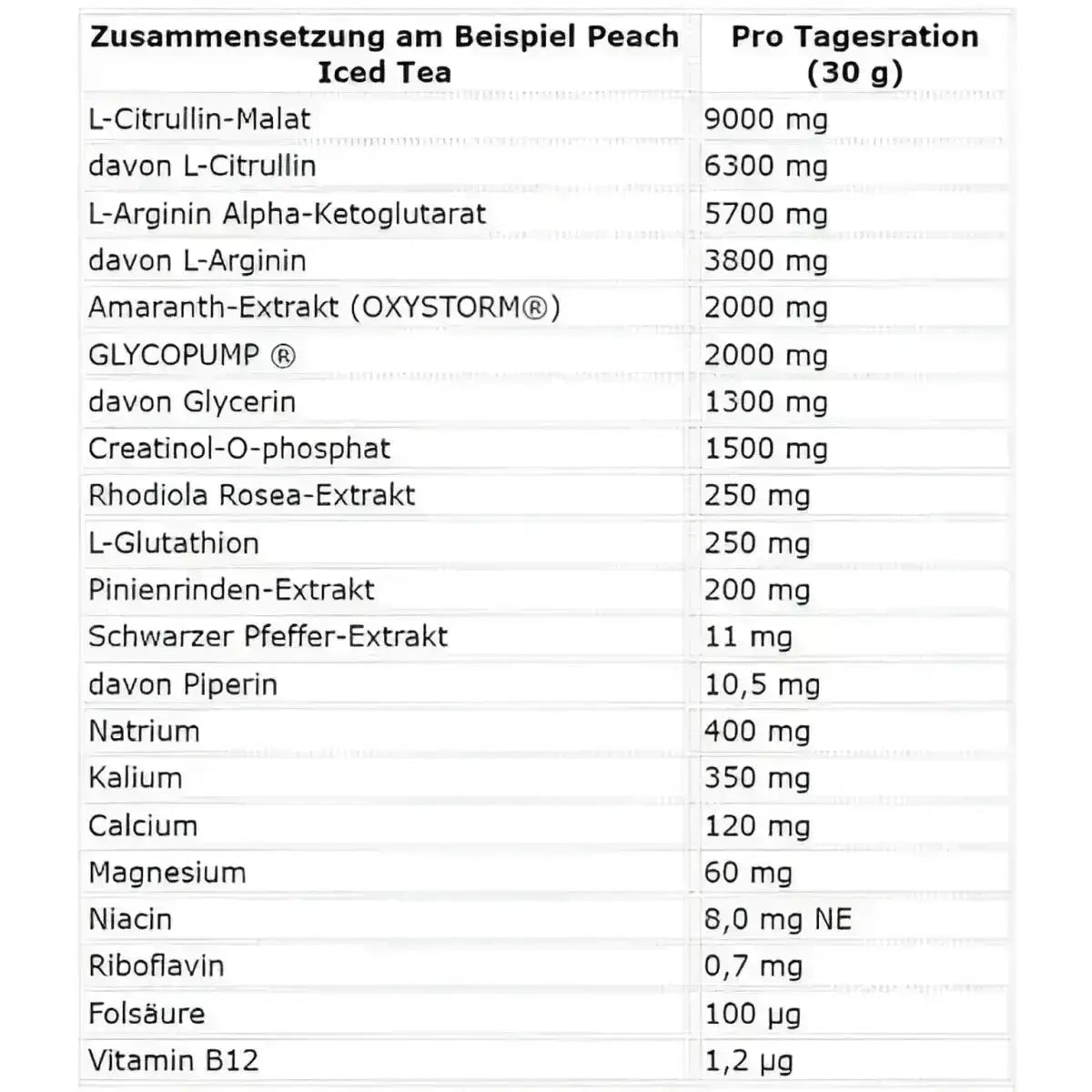 L-Citrullin-Malat (2:1), L-Arginin-Alpha-Ketoglutarat (2:1), Aroma, Glycopump® (65 % Glycerinpulver, Trenn- mittel (Siliciumdioxid)), Amaranth-Extrakt (OXYSTORM®), Natriumcitrat, Creatinol-O-Phosphat, Maltodextrin, Kalium- citrat, Calciumcitrat, Magnesiumcitrat, Rhodiola Rosea-Extrakt, L-Glutathion, Pinienrinden-Extrakt, Süßungsmittel (Sucralose, Acesulfam K), färbendes Lebensmittel (Gerstenmalzextrakt (Glutenfrei)), Säuerungsmittel (Citronensäure), Schwarzer Pfeffer-Extrakt, Niacin (Nicotinamid), Vitamin B12 (Methylcobalamin), Vitamin B2 (Riboflavin), Folsäure ((6S)-5-Methyltetrahydrofolsäure, Glucosaminsalz).