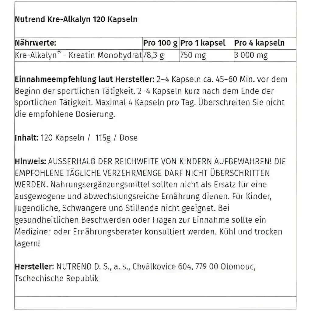 Nutrend Kre-Alkalyn ist ein hochwertiges Nahrungsergänzungsmittel, das Kre-Alkalyn als Hauptinhaltsstoff verwendet. Kre-Alkalyn ist eine gepufferte Form von Kreatinmonohydrat, die als besonders stabil und leicht verdaulich gilt. Diese spezielle Form von Kreatin soll die Vorteile von Kreatin maximieren, ohne die unangenehmen Nebenwirkungen wie Aufblähungen oder Wassereinlagerungen zu verursachen.