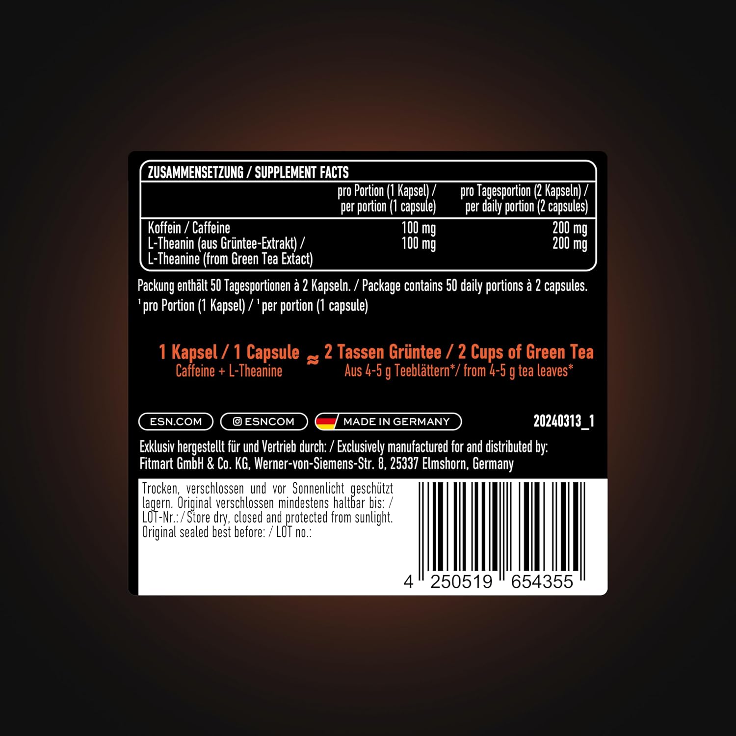 ESN Caffeine + L‑Theanine kombiniert 100 mg Koffein mit 100 mg L‑Theanine aus grünem Tee pro Kapsel – im optimalen Synergieverhältnis 1 : 1. Diese Formulierung unterstützt mentale Wachheit, Konzentration und zugleich Gelassenheit – ideal vor Training, Arbeit oder Lernphasen. Die Kapselhülle ist vegan, und das Produkt wird in Deutschland unter höchsten Qualitätsstandards produziert und labortestens geprüft.