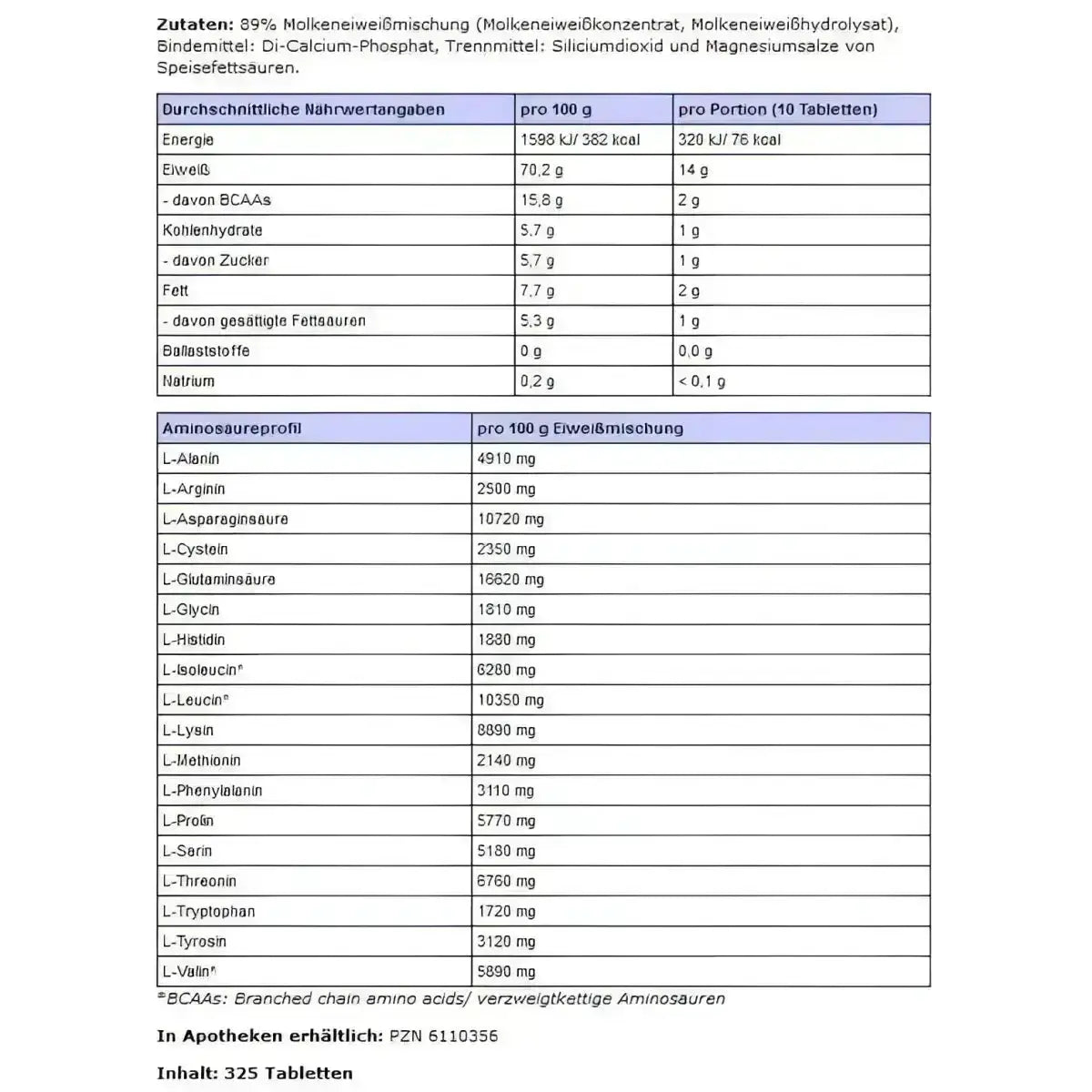 Keine Lust auf Proteinshakes? Kein Problem! Dein Whey Protein, mit essentiellen und nicht essentiellen Aminosäuren, hast du dank unserer Amino Gold Tabs immer dabei. In einer Portion (max. 10 Tabletten) bekommst du starke 14 g Protein und 3.100 mg BCAA, die dich bei deinen Trainingszielen in der Aufbauphase und oder einer Diät, unterstützen. Die optimale Zusammensetzung aus Whey Protein Konzentrat und Hydrolisat bilden den perfekten Grundbaustein für deine Proteinzufuhr. Proteingrundversorgung war nie einfacher!