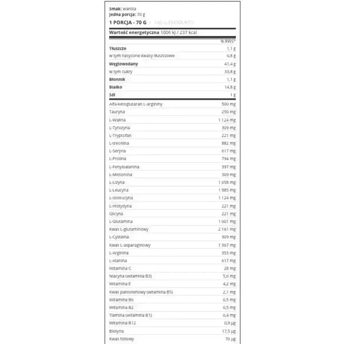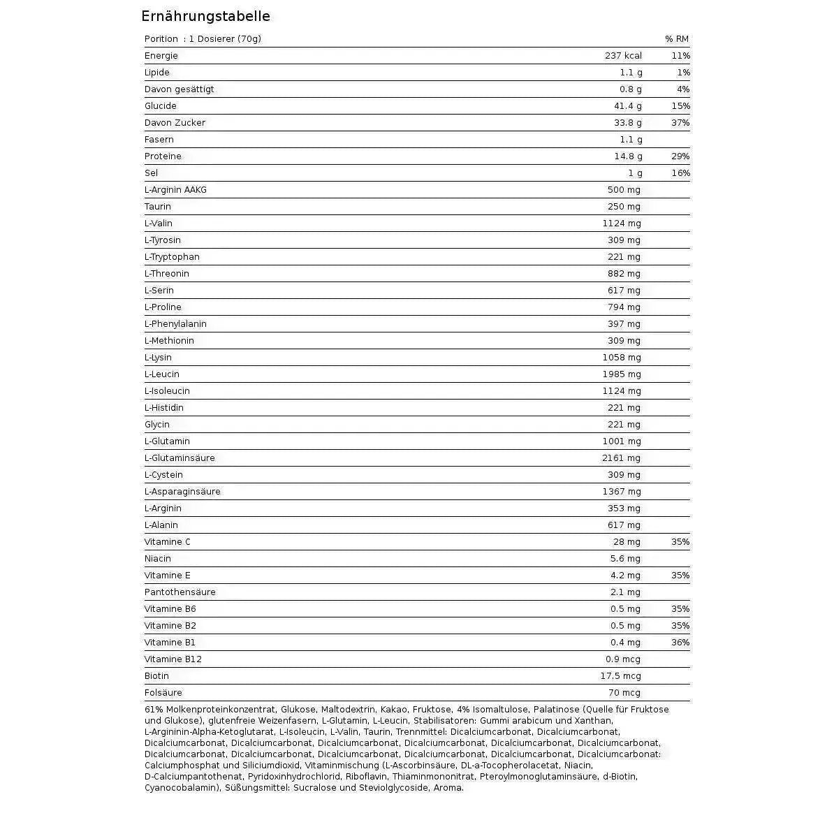 Nutrend Mass Gain enthält eine ausgewogene Mischung von Kohlenhydraten und Proteinen, die den erhöhten Energiebedarf während intensiven Trainingsphasen decken. Die enthaltenen Proteine liefern essentielle Aminosäuren, die für den Muskelaufbau und die Muskelregeneration unerlässlich sind. Die Kohlenhydrate stellen eine wichtige Energiequelle dar, um deine Trainingsleistung zu verbessern.