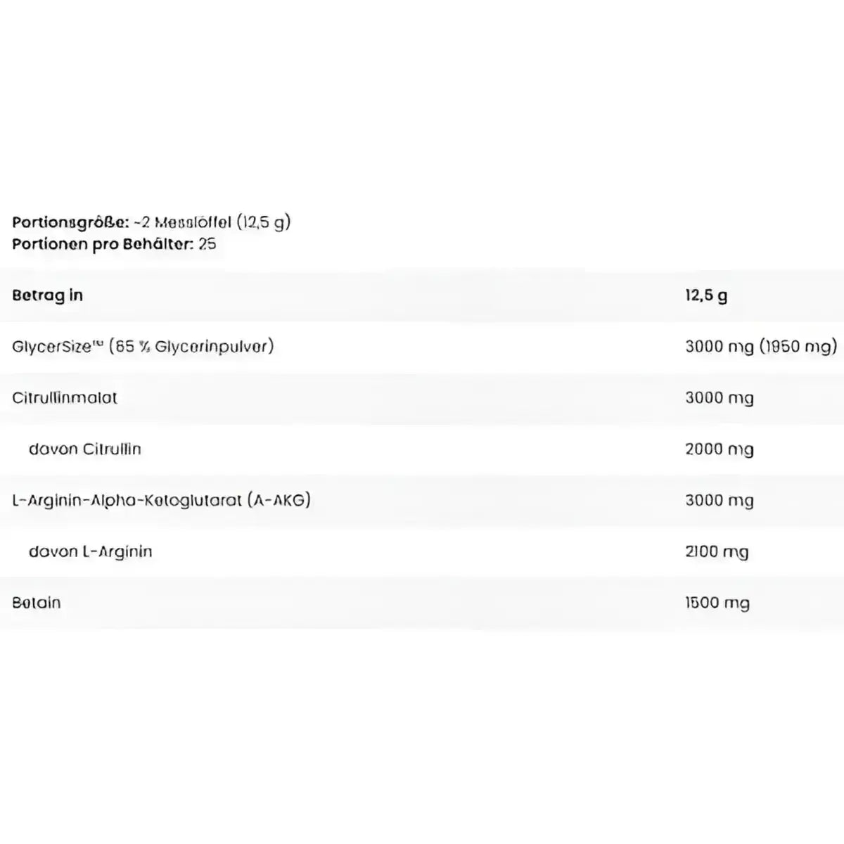 GlycerSize™ [65% Glycerinpulver, Trennmittel (E551)], Citrullinmalat, L-Arginin-Alpha-Ketoglutarat (A-AKG), Betain wasserfrei, Aromen, Trennmittel (E551), Säureregulator (E296), Salz, Rote-Bete-Saftkonzentrat1,2, Süßstoffe (Sucralose, Acesulfam K), Farbstoffe [(E160a)2,3, (E104)3].