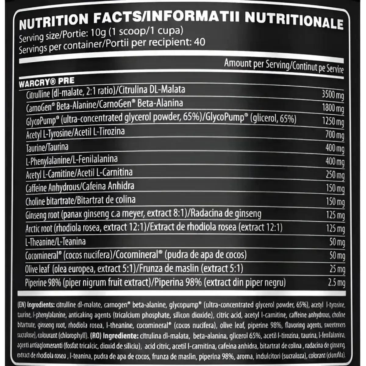 Dank seiner sorgfältig ausgewählten Inhaltsstoffe, wie z.B. Beta-Alanin, Koffein und Citrullin-Malat, liefert dir der Warcry Pre einen intensiven Energieschub und unterstützt die Muskelkraft und -ausdauer. Er fördert außerdem die Durchblutung, was zu einer verbesserten Nährstoffversorgung der Muskeln führt.