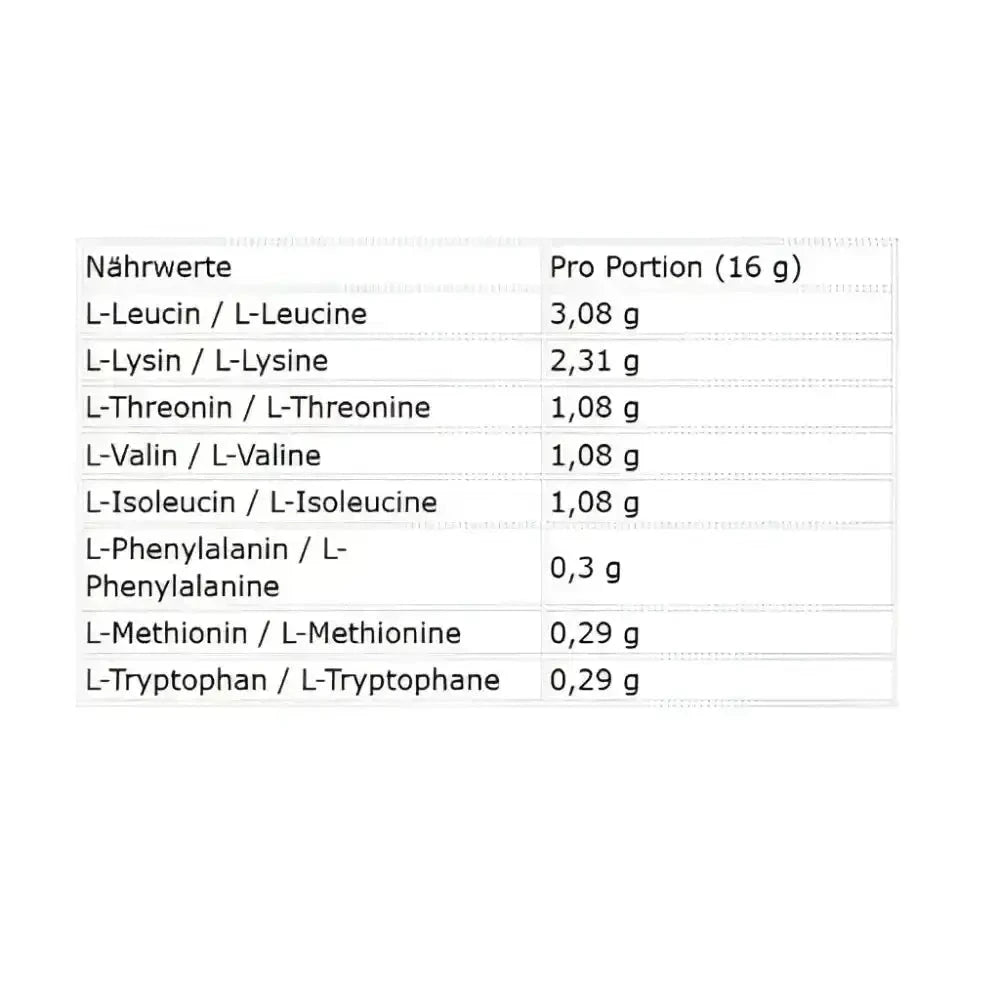 EAA‑Matrix (L‑Leucin, L‑Lysin HCl, L‑Threonin, L‑Valin, L‑Isoleucin, L‑Phenylalanin, L‑Methionin, L‑Tryptophan), Maltodextrin, Zitronensäure, Aroma, Sucralose, Siliciumdioxid.